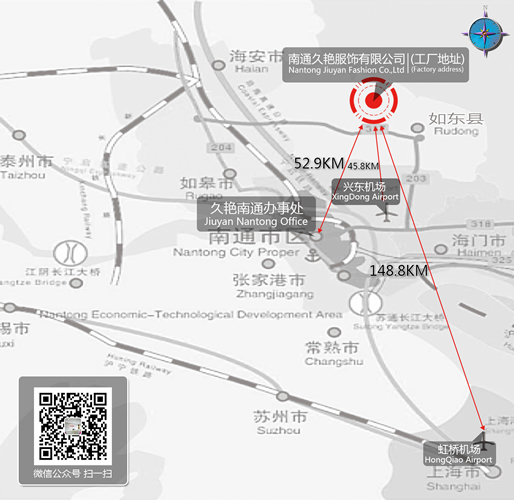 南通久艷服飾有限公司(工廠)直線距離"南通久艷辦事處"僅有52.9公里,距離"南通興東國際機(jī)場(chǎng)"僅有45.8公里,距離"上海浦東國際機(jī)場(chǎng)"僅有173.9公里,距離"上海虹橋機(jī)場(chǎng)"僅有148.8公里。"